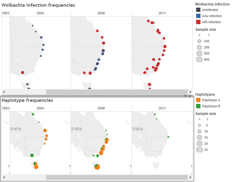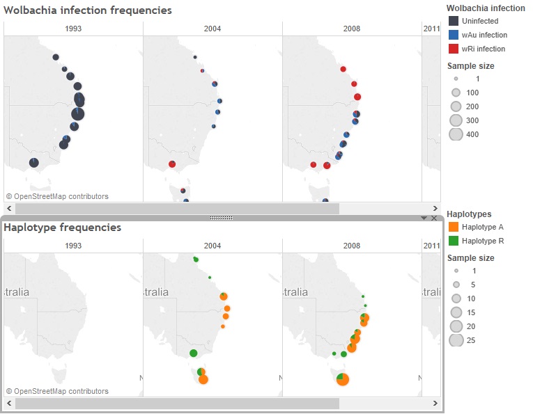 This data file contains numbers of infections with the Wolbachia variant wAu and wRi and numbers of mtDNA haplotypes A and R for Drosophila simulans populations collected in 1993-1994 (12 populations, data from Hoffmann et al. 1996, Heredity), in 2004 (11 populations), in 2008 (14 populations), and in 2011-2012 (26 populations) (Fig. 1). Note that latitudes and longitudes are approximate for the years 1993-1994.