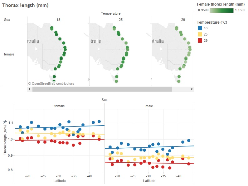 This data file contains raw thorax length of female and male D. melanogaster from three replicate vials at three rearing temperatures and from 18 populations collected in 2008 (Fig. 1).