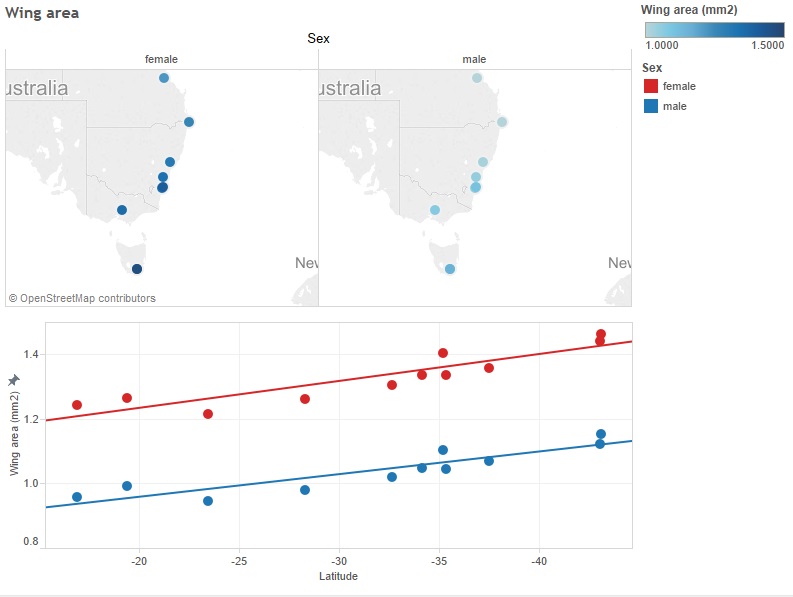 This data set contains means and standard deviations (SD) of wing area (mm2) for females and males of 19 Drosophila melanogaster locations collected at 11 latitudes in 2000 (extracted from Fig.1).