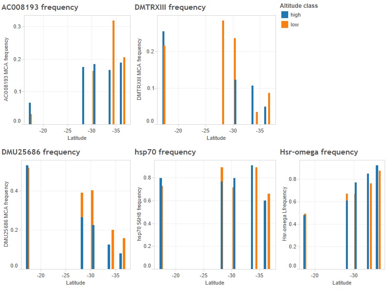 This data file contains allele frequencies for five molecular markers (hsp70, DMTRXIII, hsr-omegaL/S, DMU25686 and AC008193) for D. melanogaster originating from a high and low altitude population at five latitudes (ten populations) collected in 2002. Allele frequencies are shown for the most common allele, MCA (Fig. 4).