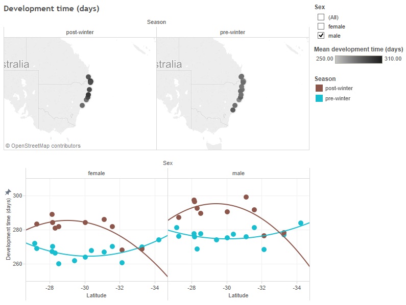 This data file contains mean development time (hours) for female and male Drosophila serrata populations collected before (14 populations) and after (10 populations) winter in 1999 (Fig. 1). Note longitudes in data are approximate.