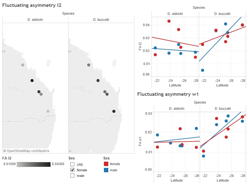This data file contains fluctuating asymmetry for different wing measurements (l2, l3p, lpd, l3, w1, w2, w3) for wild-caught females and males of 5 Drosophila buzzatii and aldrichi that were collected in 1994.