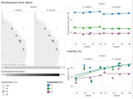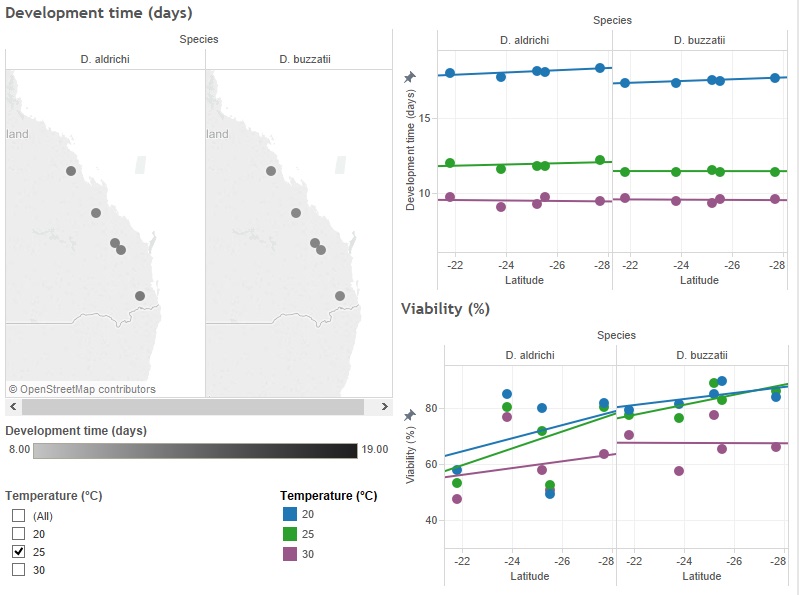 This data file contains mean development time (days) and viability (%) for 5 Drosophila buzzatii and aldrichi lab populations that were collected in 1994. These populations were kept in the lab for five generations at 25°C and measurements were taken on progeny of the fifth generation which were reared at three temperature treatments (20, 25 and 30°C).
