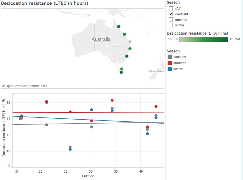 This data file contains desiccation resistance (LT50 in hours) for groups of 10 females of 8 Drosophila melanogaster populations collected in 2001 and kept under three seasonal conditions (Fig. 1). Note longitudes in data are approximate.